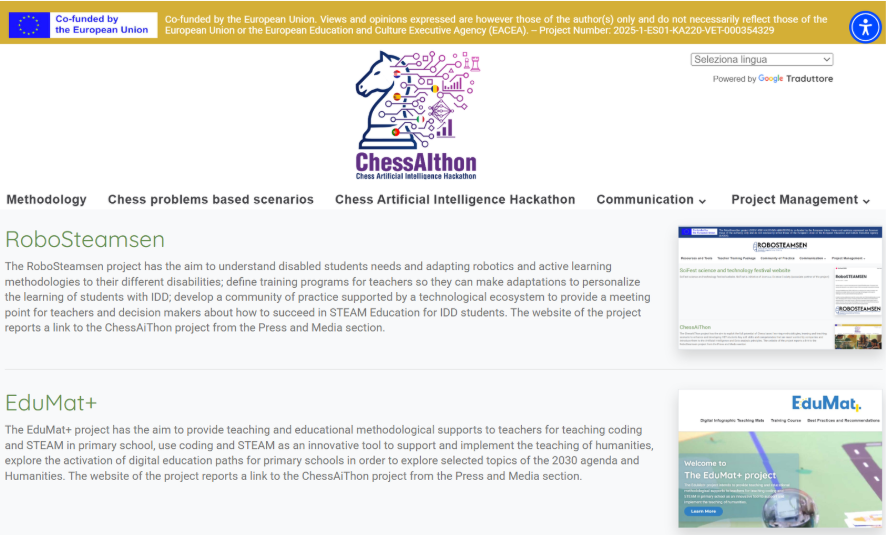 The ChessAiThon project has the aim to exploit the full potential of Chess based learning methodologies, learning and teaching scenario to enhance and developing VET students key soft skills and competencies that are most wanted by companies and introduce them to the Artificial Intelligence and Data analysis principles. The website of the project reports a link to the EduMat+ project from the Press and Media section.