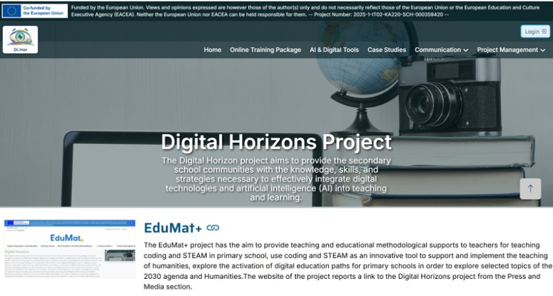 The Digital Horizons project has the aim to provide the secondary school communities with the knowledge, skills, and strategies necessary to effectively integrate digital technologies and artificial intelligence (AI) into teaching and learning. The specific objectives of the project are: strengthening Digital Competence by training secondary school teachers, students, and parents with a structured training on the responsible and effective use of digital technologies and AI. Training will cover ethical considerations, cyber security, digital well-being, and AI literacy, ensuring participants develop practical skills for safe and informed digital engagement, providing Ready-to-Use AI and Digital based Tools for education by creating an online repository of validated AI and digital tools for teachers and students integrated with lesson plans and guidelines, enabling educators to integrate AI effectively into their teaching practices, promoting Best Practices and Changing the Digital Narrative by creating a collection of 10 motivational video case studies from schools that have successfully integrated AI and digital technologies. The website of the project reports a link to the EduMAt+ project from the Press and Media section.